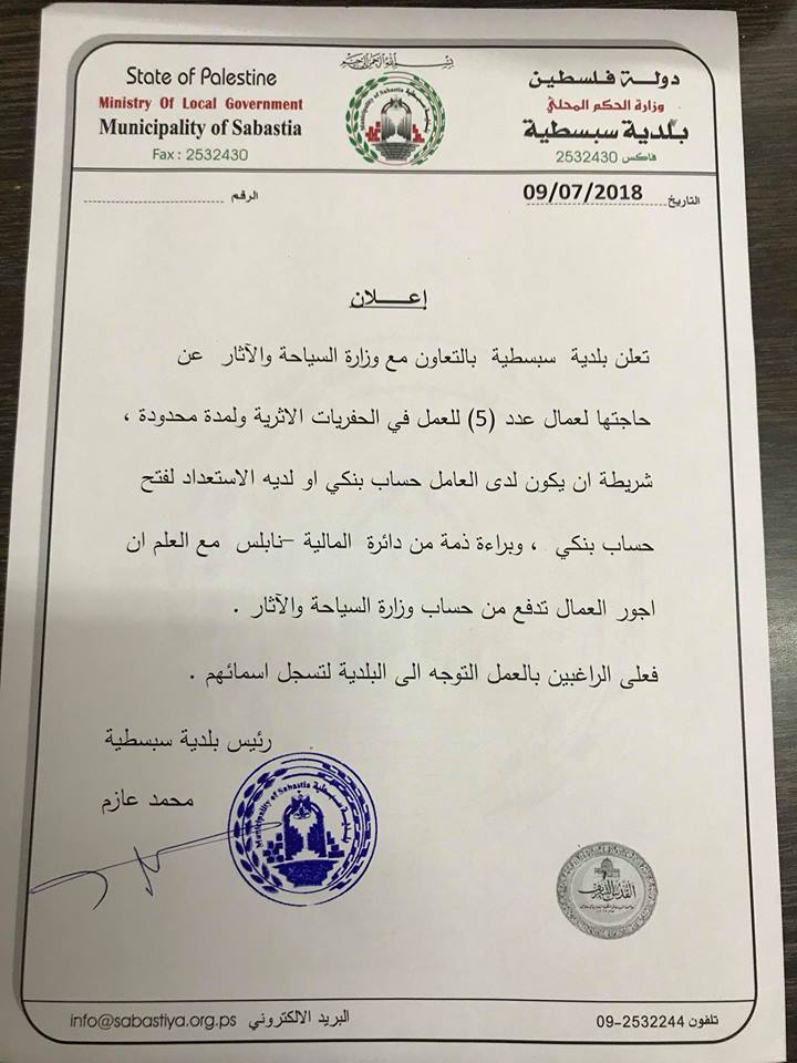 بلدية سبسطية ووزارة السياحة والآثار تعلن عن حاجتها لعمال في الحفريات الأثرية.