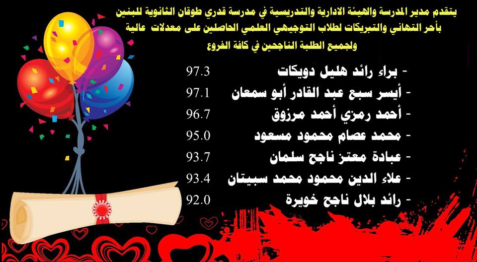 مدرسة قدري طوقان الثانوية للبنين تنشر أسماء أوائل المدرسة في الثانوية العامة لعام 2018.