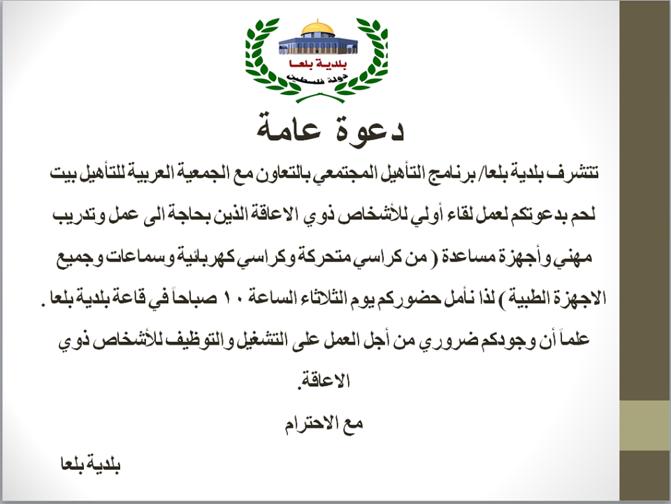 بلدية بلعا وبالتعاون مع الجمعية العربية للتأهيل في بيت لحم تنظم لقاءً أوليّاً للأشخاص ذوي الإعاقة في قاعة البلدية.