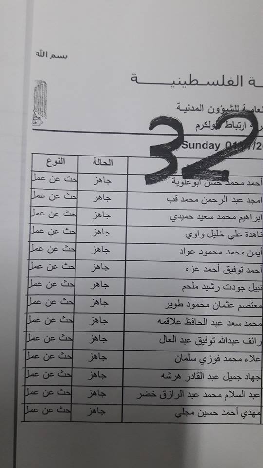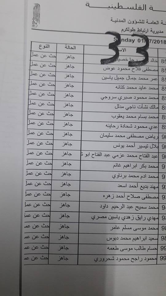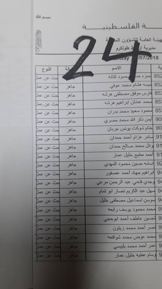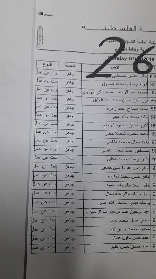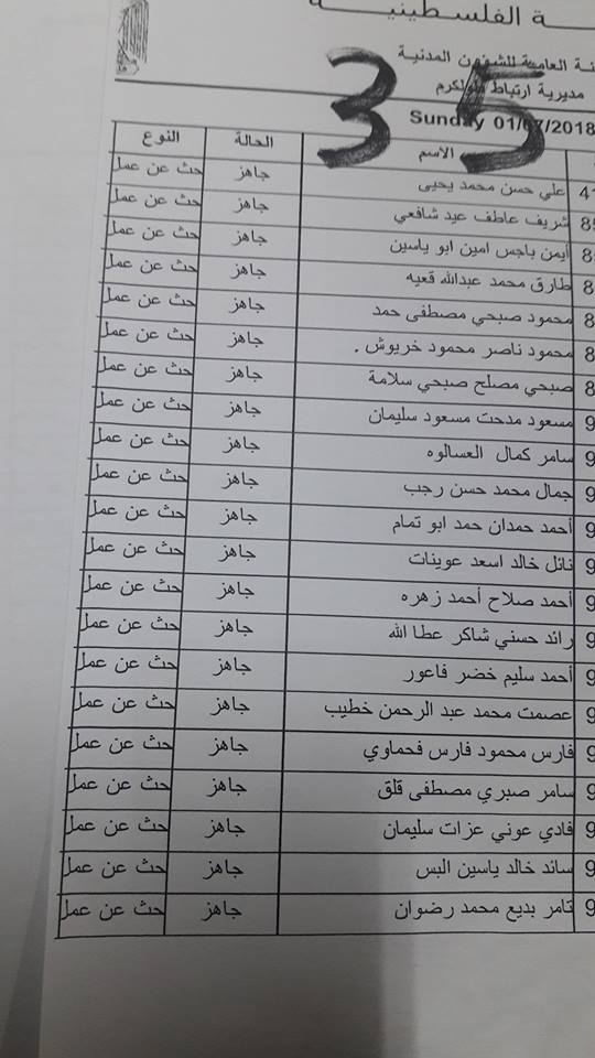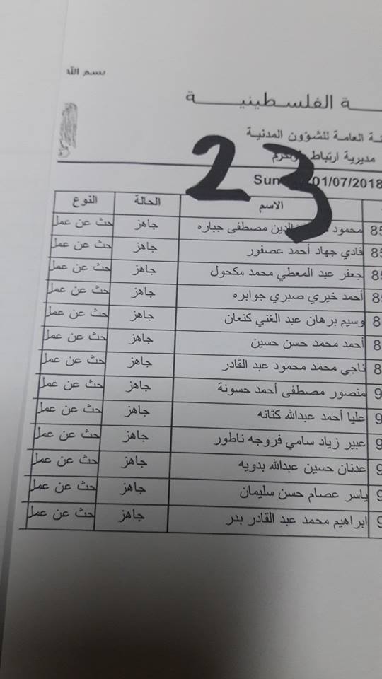 الارتباط المدني الفلسطيني ينشر أسماء المقبولين لتصاريح البحث عن عمل والتي يسري مفعولها من تاريخ 22.07.2018 ولغاية 26.07.2018.