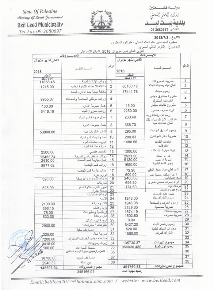 التقرير المالي لبلدية بيت ليد في حزيران