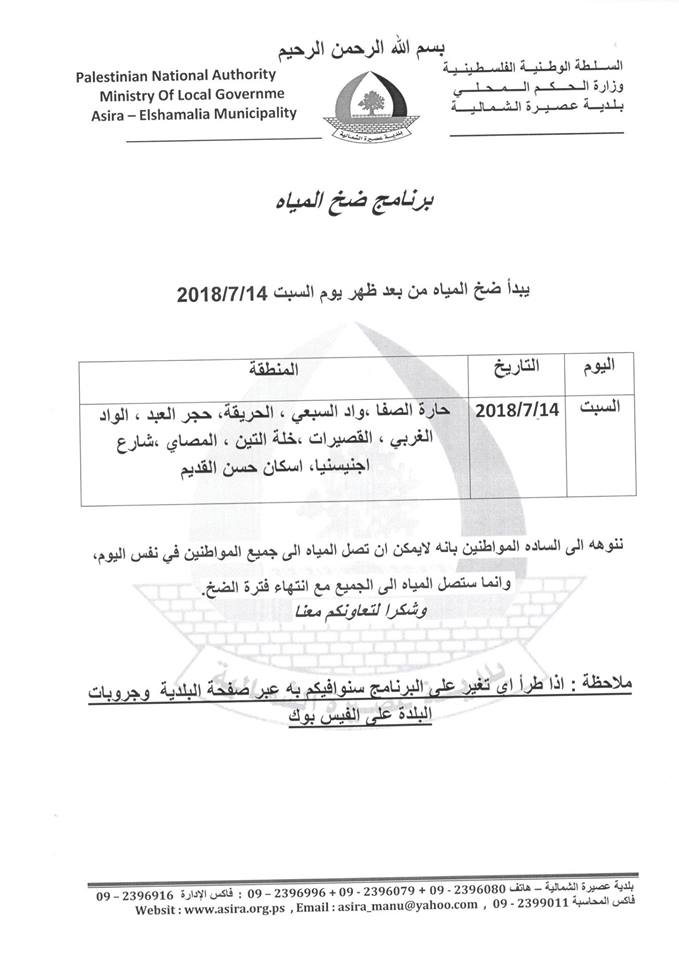 جدول ضخ المياه في عصيرة الشمالية يبدأ عقب ظهر يوم السبت 14.07.2018.