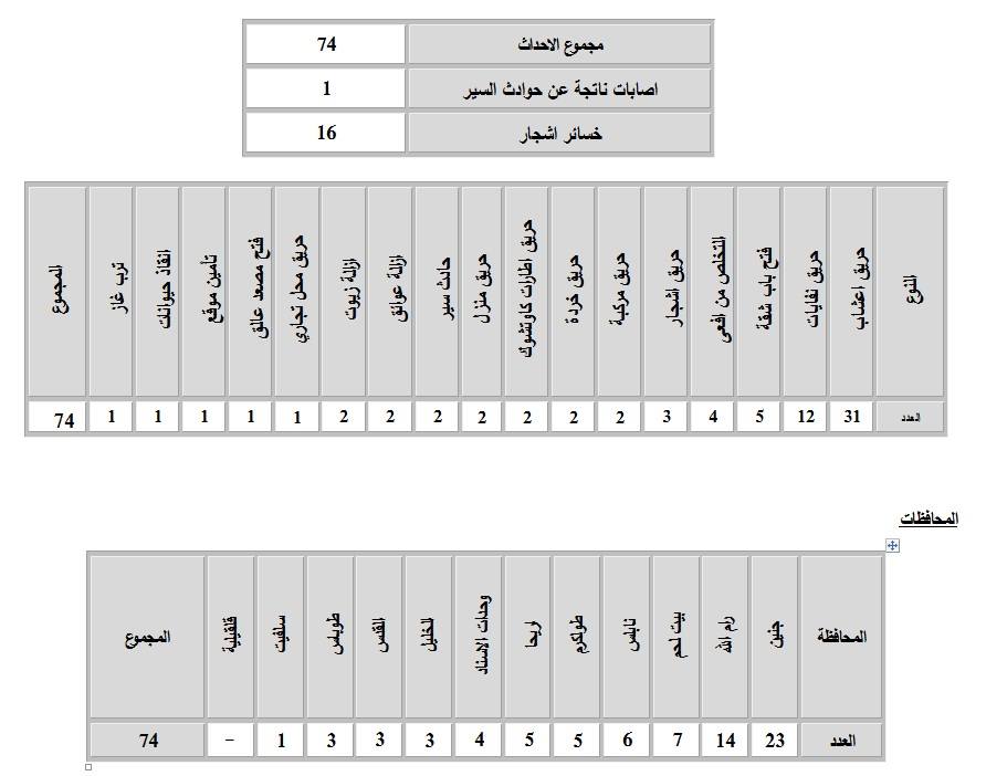 تعاملت طواقم الدفاع المدني من صباح يوم الأحد 15.07.2018، حتى صباح الاثنين 16.07.2018، 74 حادث إطفاء وإنقاذ، كان منها 55 حادث إطفاء و19 حادث إنقاذ.