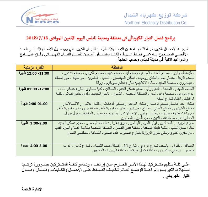 شركة توزيع كهرباء الشمال تعلن عن مواعيد ومناطق قطع التيار ليوم الاثنين 16.07.2018.