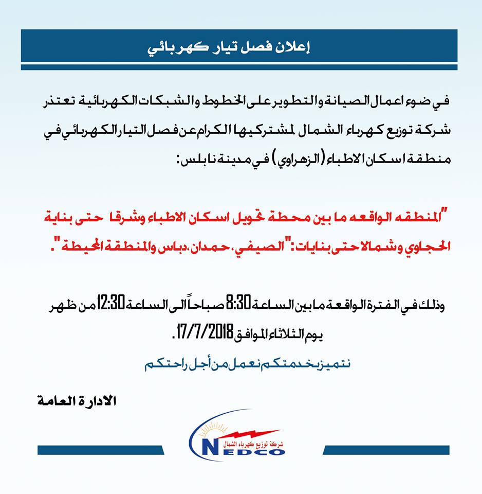 شركة توزيع كهرباء الشمال تنشر مواعيد ومناطق قطع الكهرباء ليوم الثلاثاء 17.07.2018.