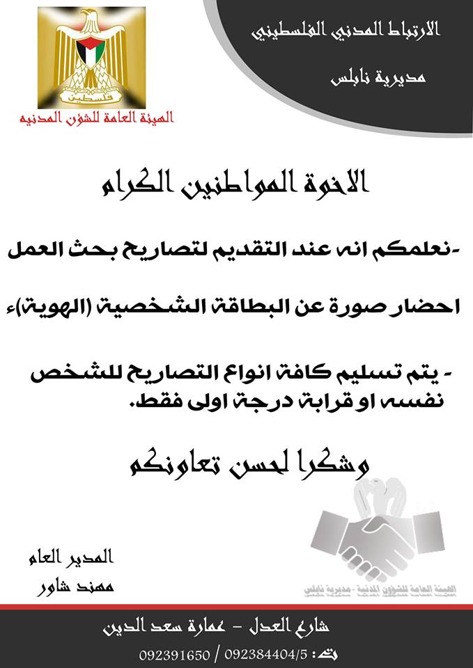 الهيئة العامة للشؤون المدنية - مديرية نابلس تنشر تنويهاً للراغبين بالحصول على تصريح للعمل.