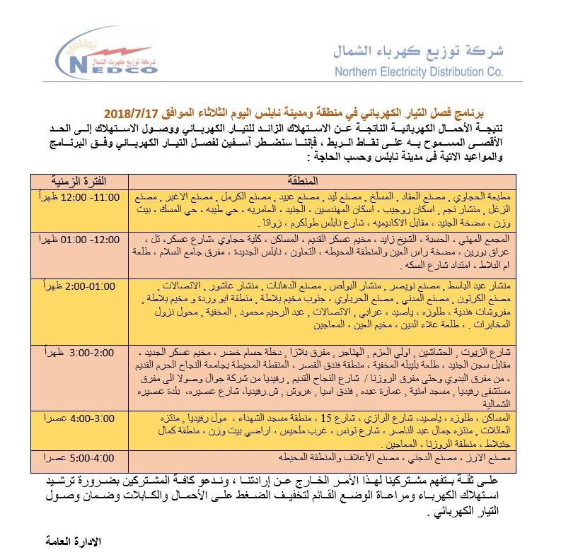 شركة توزيع كهرباء الشمال تنشر برنامج فصل التيار الكهربائي في نابلس ليوم الثلاثاء 17.07.2018.