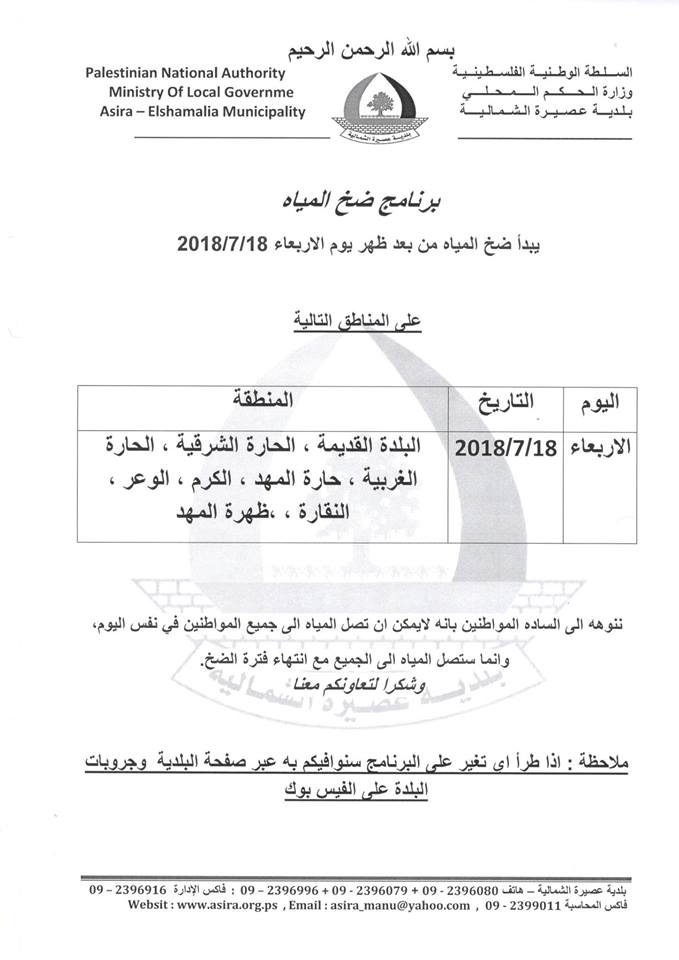 جدول ضخ المياه في عصيرة الشمالية يبدأ بعد ظهر الأربعاء 17.07.2018.
