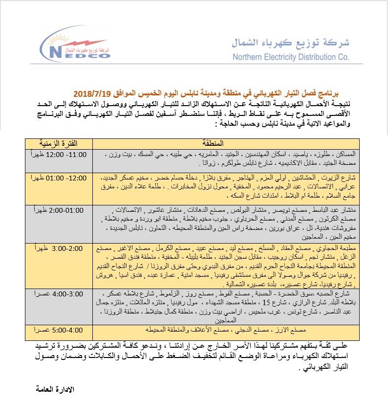 شركة توزيع كهرباء الشمال تنشر مواعيد ومناطق قطع الكهرباء ليوم الخميس 19.07.2018.