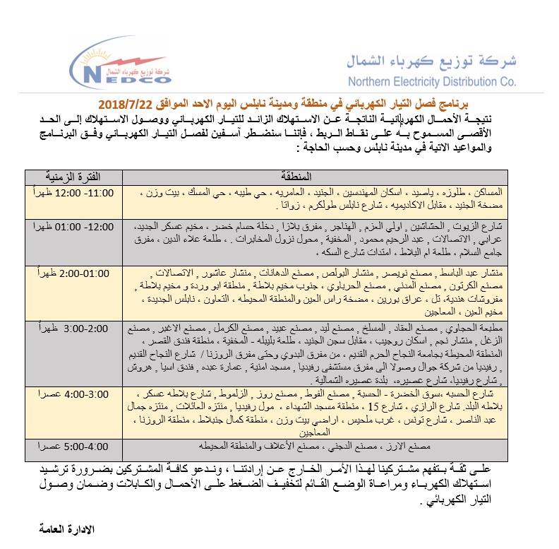 بسبب الأحمال الزائدة، شركة كهرباء الشمال ستقوم بفصل التيار الكهربائي عن المناطق التالية بمدينة نابلس وضواحيها وفي هذه الأوقات: