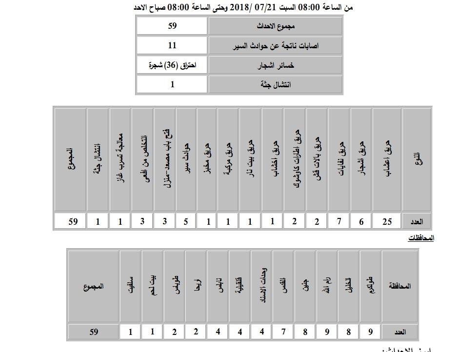 طواقم الدفاع المدني تخمد 46 حريقاً وتتعامل مع 13 حادث إنقاذ خلال 24 ساعة الماضية بمختلف محافظات الضفة الغربية.