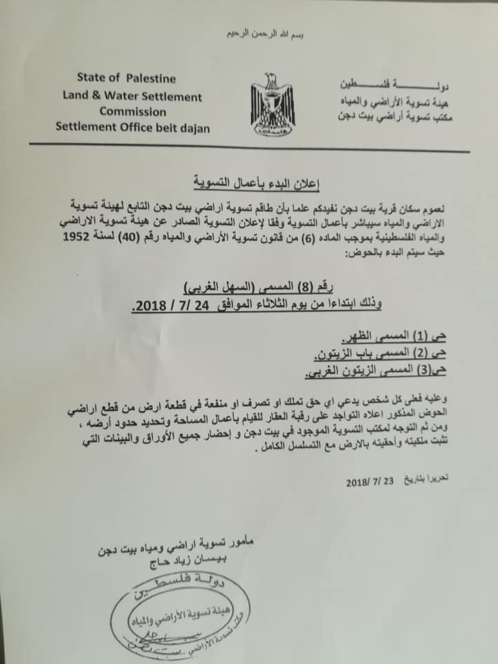 مكتب تسوية الأراضي في قرية بيت دجن يعلن بدء أعمال التسوية في حوض رقم (8) المسمى بالسهل الغربي.