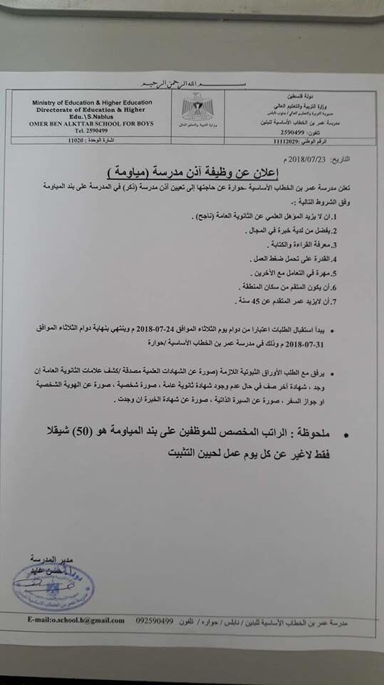 وظيفة شاغرة في مدرسة بنابلس