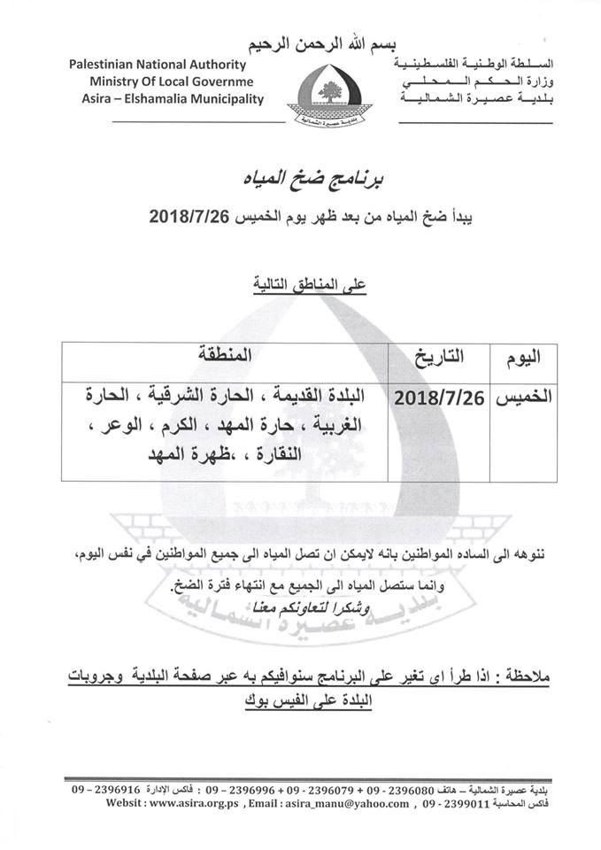 جدول توزيع المياه في عصيرة الشمالية ويبدأ ضخ المياه يوم الخميس 26.07.2018.