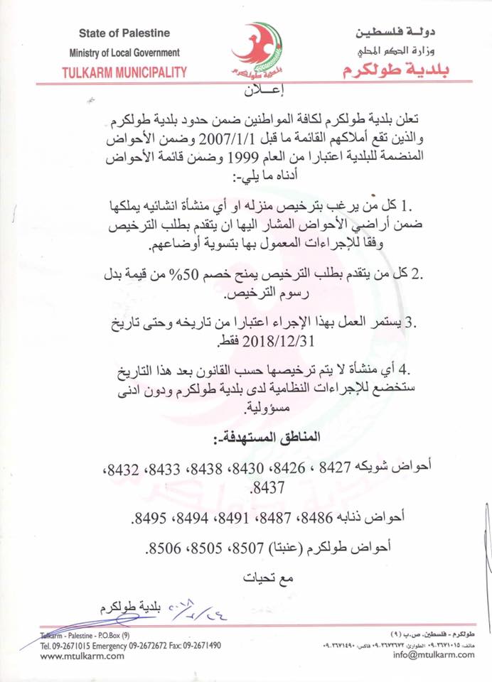 بلدية طولكرم تنشر إعلاناً هاماً لسكان المدينة ضمن حدود بلدية طولكرم.
