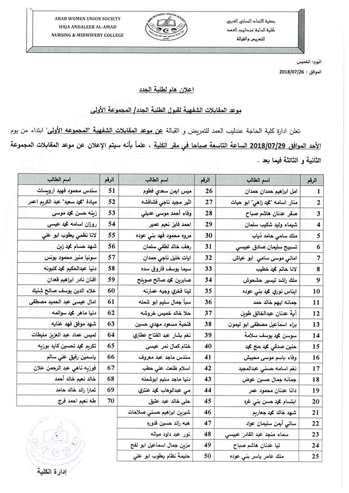 إعلان هام من كلية العندليب عن أسماء الطلبة المدعوين لحضور المقابلة الشفهية للمجموعة الأولى.