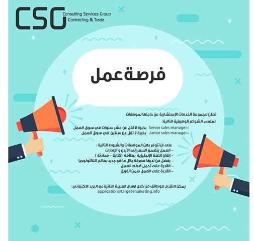 -Junior sales manager بخبرة لا تقل عن سنتين في سوق العمل