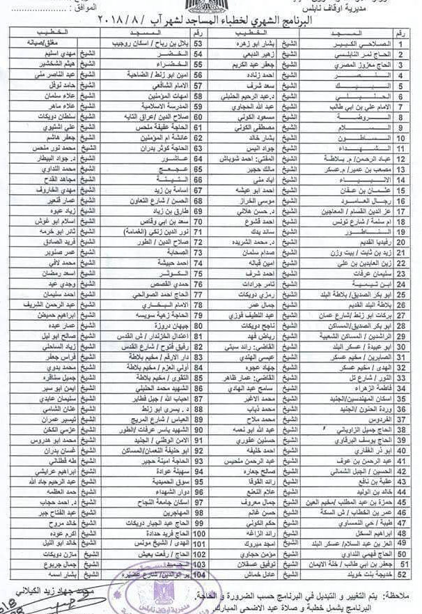 خطباء صلاة الجمعة في مساجد نابلس ليوم الجمعة 03.08.2018.