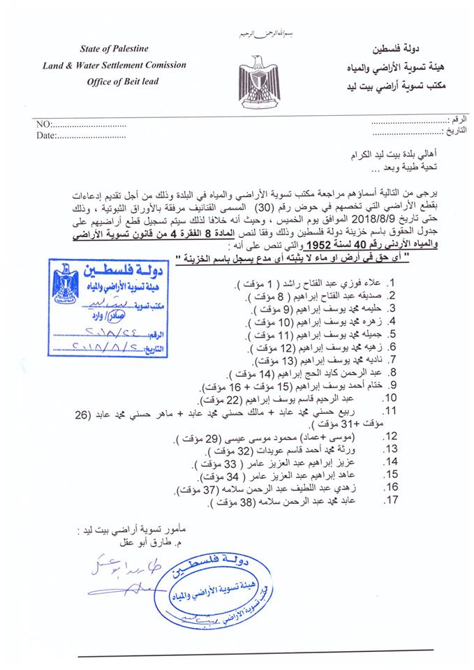 بلدية بيت ليد تنشر أسماء أشخاص عليهم مراجعة البلدية بخصوص تسوية الأراضي والمياه وذلك حتى تاريخ 09.08.2018.