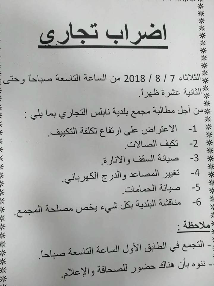 إضراب تجاري في المجمع التجاري وسط نابلس يوم الثلاثاء 07.08.2018.