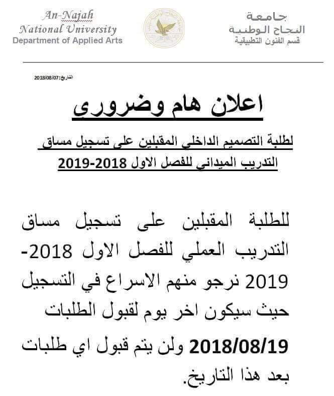 كلية الفنون في جامعة النجاح تدعو طلبة التصميم الداخلي للمسارعة في تسجيل مساق التدريب العملي.