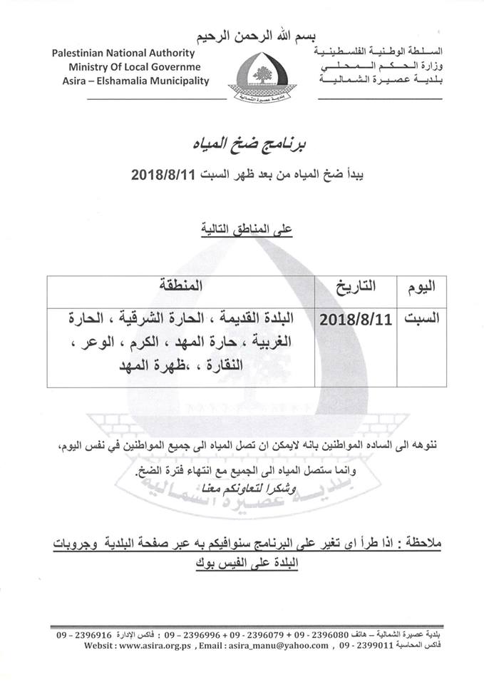 جدول توزيع المياه في بلدة عصيرة الشمالية ويبدأ ضخ المياه عقب ظهر يوم السبت 11.08.2018.