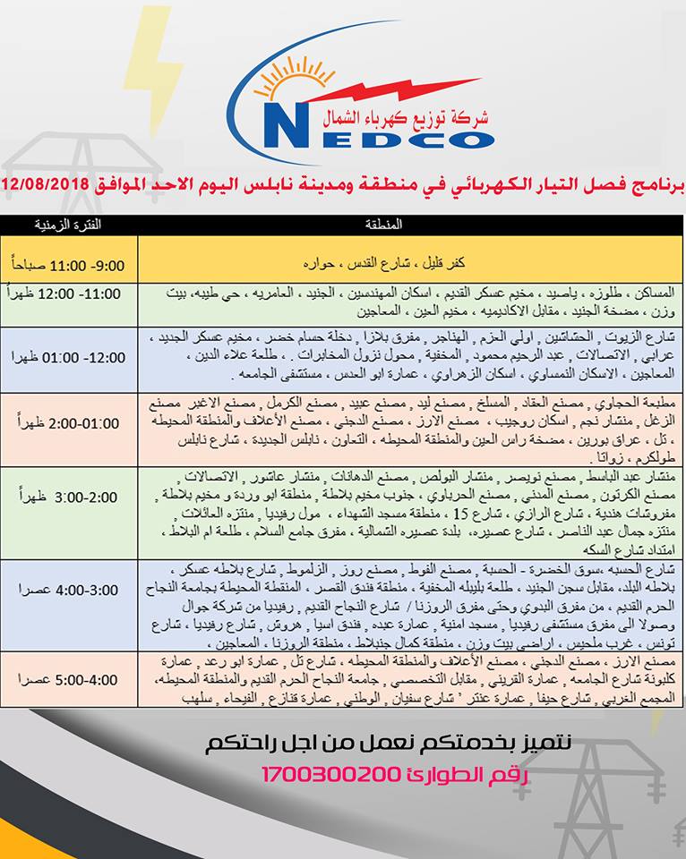 شركة توزيع كهرباء الشمال تعلن عن مواعيد وأماكن فصل التيار لمدة ساعة، يوم الأحد 11.08.2018.