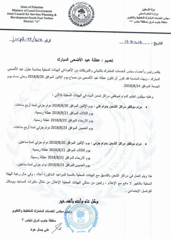 مجلس الخدمات المشترك للتخطيط والتطوير لمناطق جنوب شرق نابلس يحدد مواعيد شحن المياه للمجالس البلدية والقروية خلال عطلة عيد الأضحى.