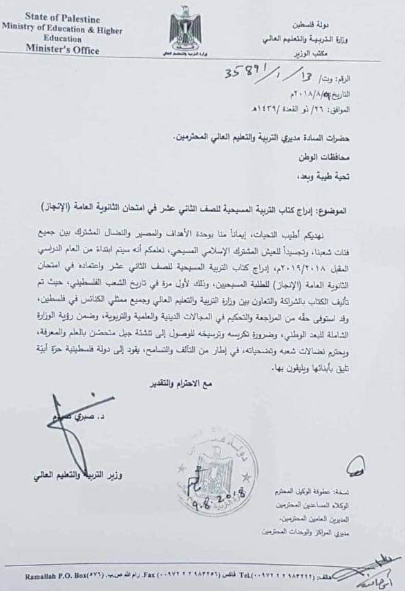 وزارة التربية والتعليم تعتمد كتاب التربية المسيحية لطلبة الإنجاز المسيحيين للعام الدراسي المقبل 2018/2019.