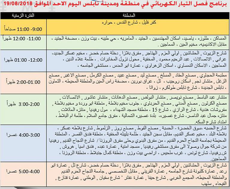 شركة كهرباء الشمال تعلن عن مواعيد ومناطق فصل الكهرباء في نابلس، يوم الأحد 19.08.2018.