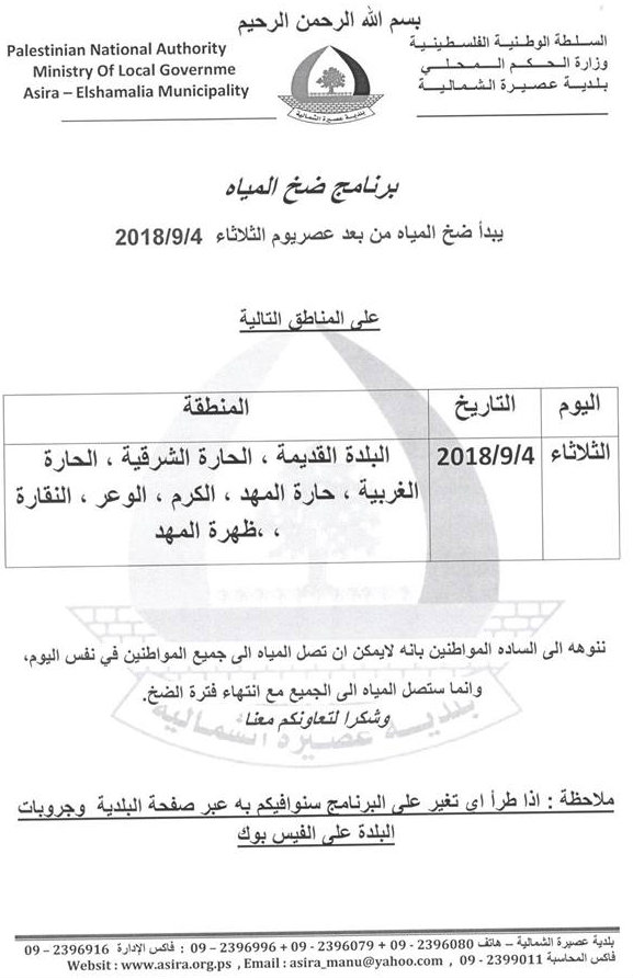جدول توزيع المياه في عصيرة الشمالية، ويبدأ ضخ المياه بعد عصر الثلاثاء 04.09.2018.
