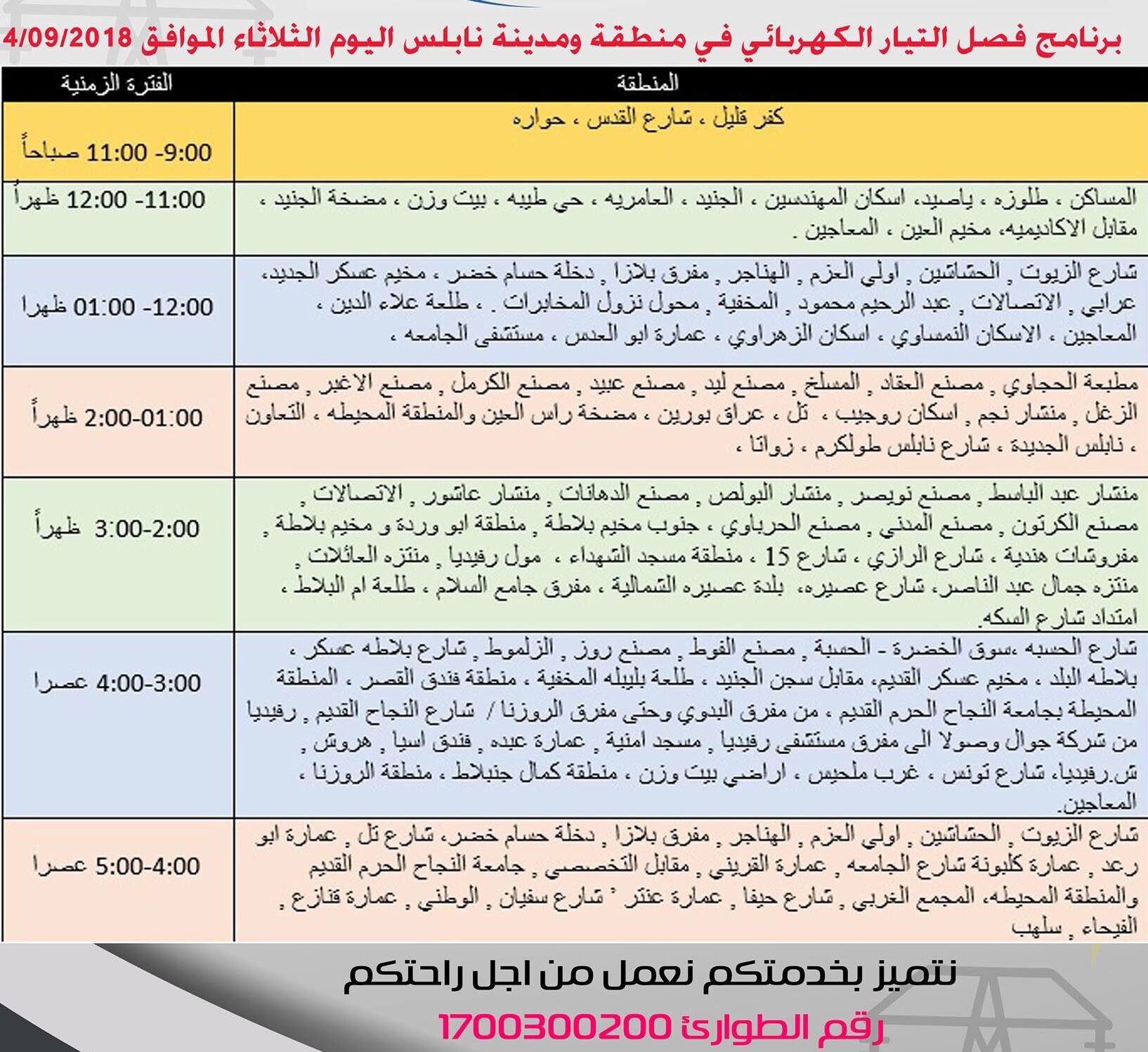 شركة توزيع كهرباء الشمال تعلن عن مواعيد ومناطق قطع الكهرباء في نابلس.