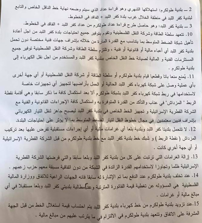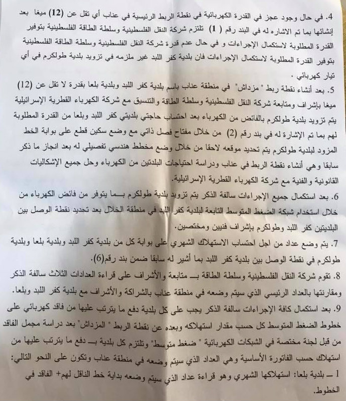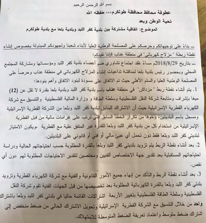 بلدية كفر اللبد تنشر ملخصاً لاتفاقية ثلاثية مشتركة لإنشاء نقطة ربط "مزلاج كهربائي" بين كفر اللبد وبلعا وطولكرم.