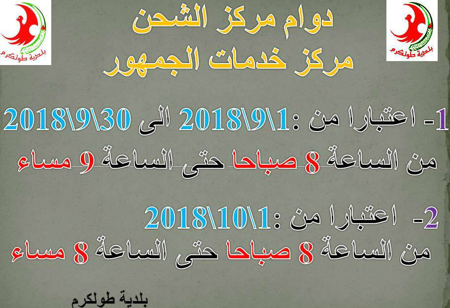 بلدية طولكرم تعلن عن تغيير مواعيد شحن الكهرباء في مركز خدمات الجمهور.
