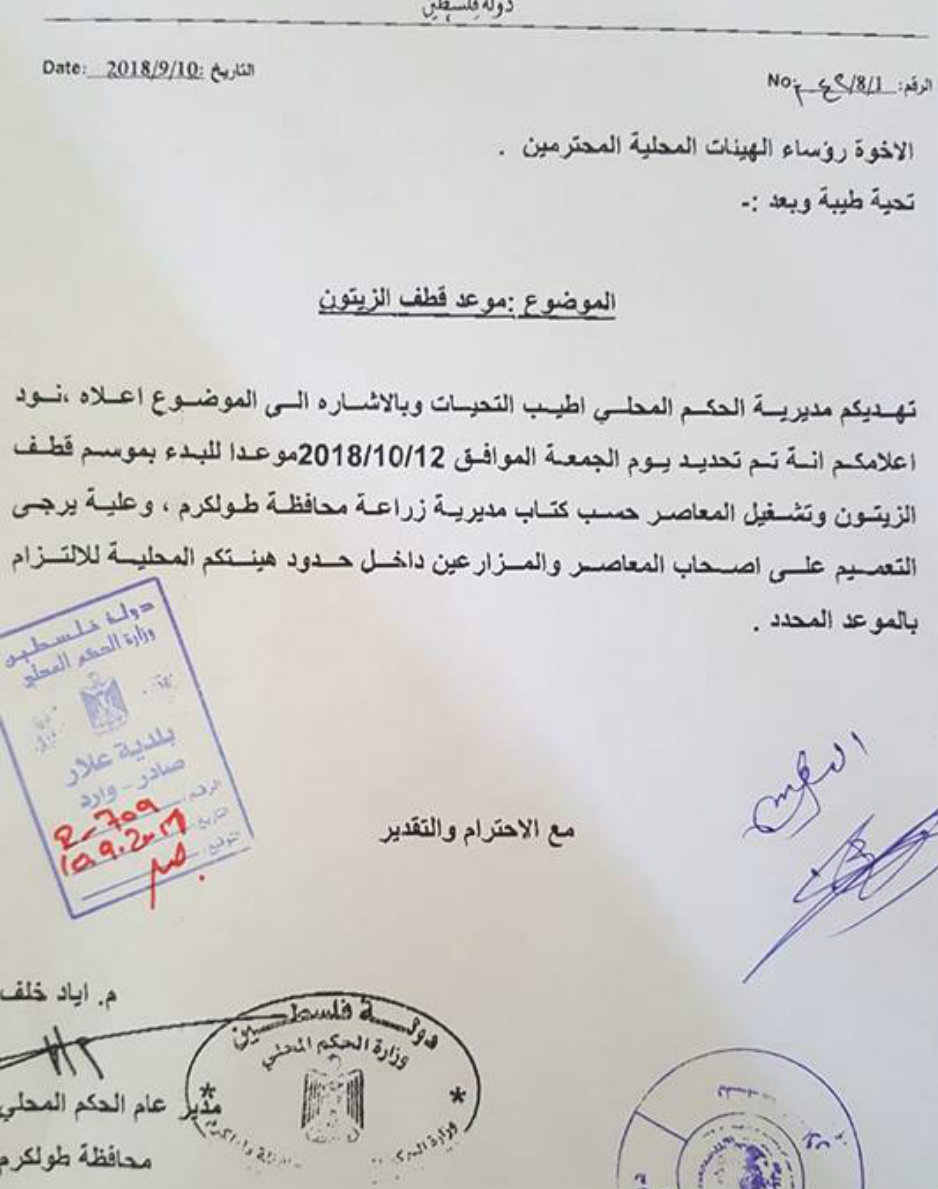 مديريتا الحكم المحلي والزراعة يعلنان عن بدء موسم قطف الزيتون وتشغيل المعاصر في بلدة علار اكتوبر القادم.