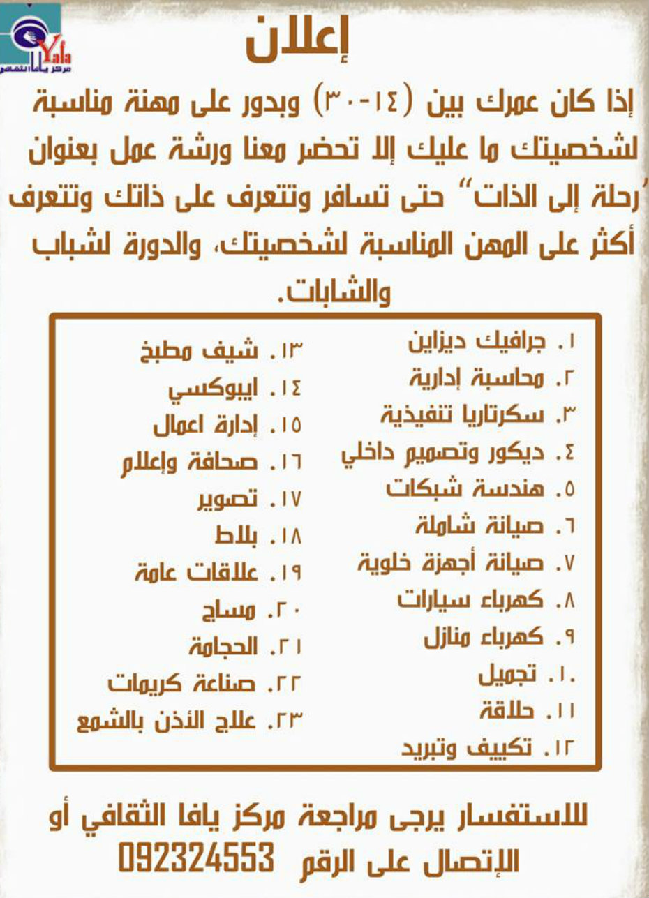 يعلن مركز يافا الثقافي عن عقده لورشة عمل بعنوان "رحلة إلى الذات" للشباب والشابات، وتستهدف الدورة الأعمار ما بين (14-30).