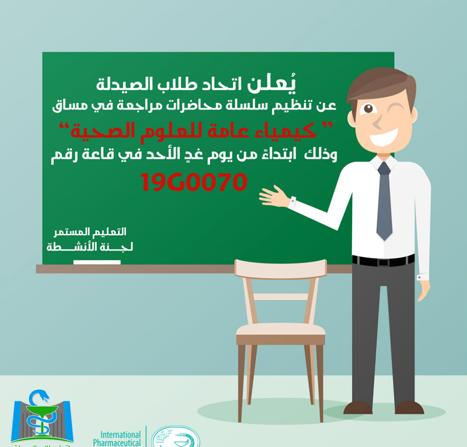 اتحاد طلاب الصيدلة في جامعة النجاح يعلن عن عقد عدة محاضرات مراجعة في مساق (كيمياء عامة للعلوم الصحية).