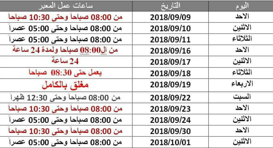 تعلن الإدارة العامة للمعابر والحدود عن تعديل ساعات العمل على المعبر، وعليه يعمل معبر الكرامة يوم الثلاثاء 18.09.2018 حتى الساعة 8:30 صباحا ويتم إغلاق المعبر في كلا الاتجاهين بسبب الأعياد اليهودية، ويعاد فتح المعبر الخميس 20.09.2018 من الساعة 8:00 صباحا وحتى الساعة التاسعة والنصف مساء في كلا الاتجاهين.