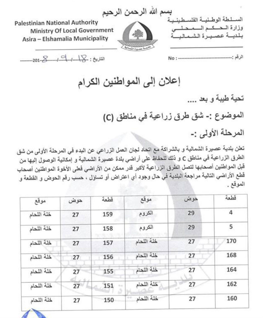 تعلن بلدية عصيرة الشمالية بالشراكة مع اتحاد لجان العمل الزراعي يوم الثلاثاء 18.09.2018، عن بدء المرحلة الأولى لشق طرق زراعية في مناطق C، في سبيل تسهيل وصول أصحاب الأراضي إلى أراضيهم، وعليه تنوه البلدية إلى ضرورة مراجعتها في حال وجود استفسار أو اعتراض.
