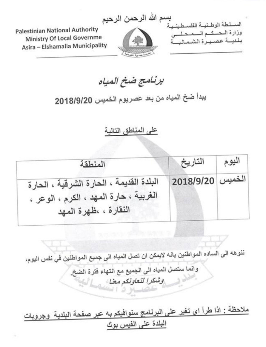 بلدية عصيرة الشمالية تنشر أسماء المناطق التي ستضخ فيها المياه ليوم الخميس 20.09.2018.