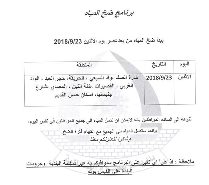 برنامج ضخ المياه في عصيرة الشمالية ليوم الاثنين 24.09.2018.