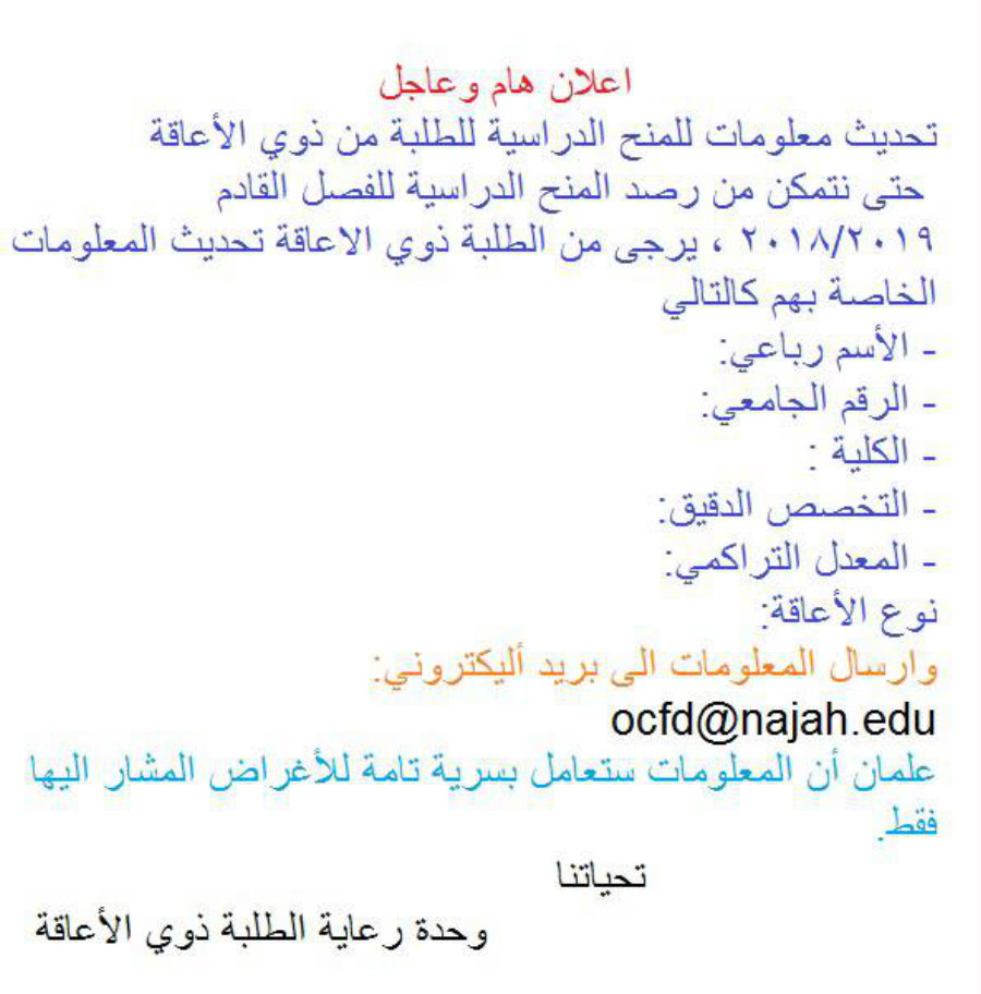 وحدة رعاية الطلبة ذوي الإعاقة في جامعة النجاح تنوه للطلبة ذوي الاحتياجات الخاصة بضرورة تحديث معلوماتهم على صفحة زاجل.