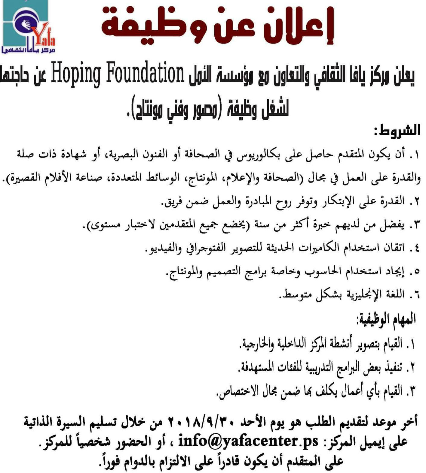 وظيفة شاغرة في خضوري الخليل