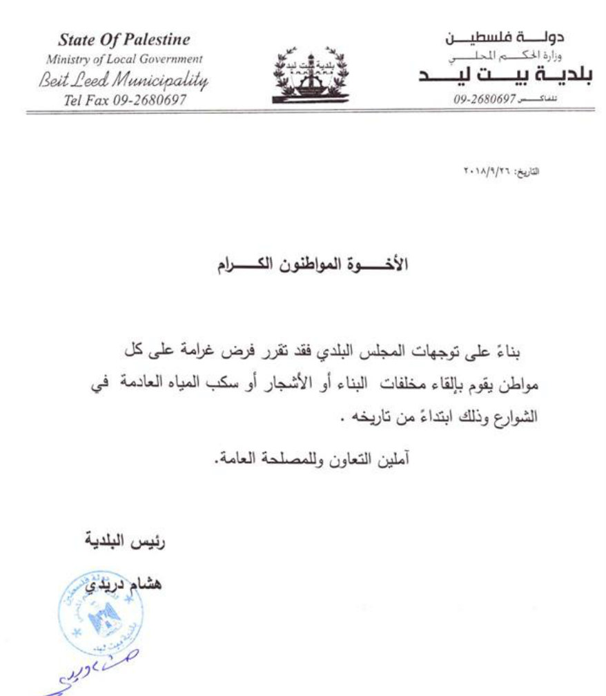 بلدية بيت ليد تقر يوم الأربعاء 26.09.2018، غرامة مالية لكل من يلقي المخلفات في الشارع.