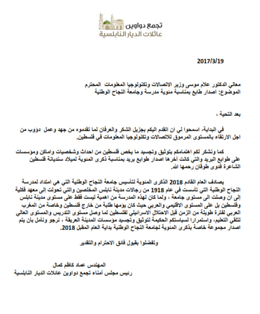 بمناسبة مئوية النجاح، بادر تجمع دواوين عائلات الديار النابلسية ممثلاً برئيسه عماد كمال، بتقديم فكرة إصدار طابع بريدي يحمل اسم النجاح. وبذلك ستجوب جامعة النجاح العالم من خلال طابعها البريدي.