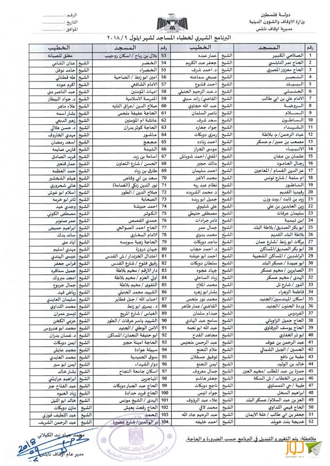 خطباء صلاة الجمعة في مساجد مدينة نابلس وضواحيها للجمعة الأخيرة من شهر أيلول 2018.