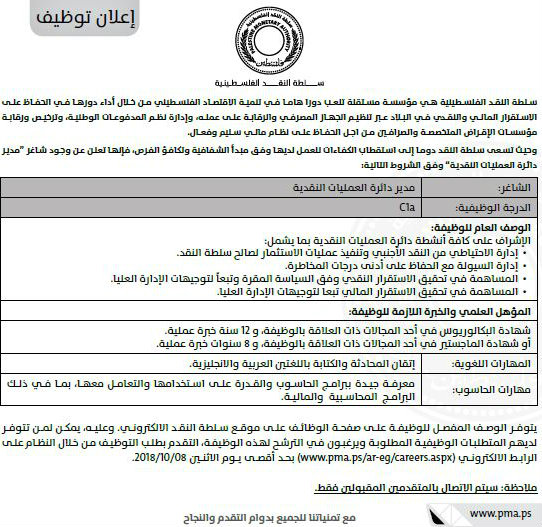 وظيفة شاغرة في سلطة النقد الفلسطينية