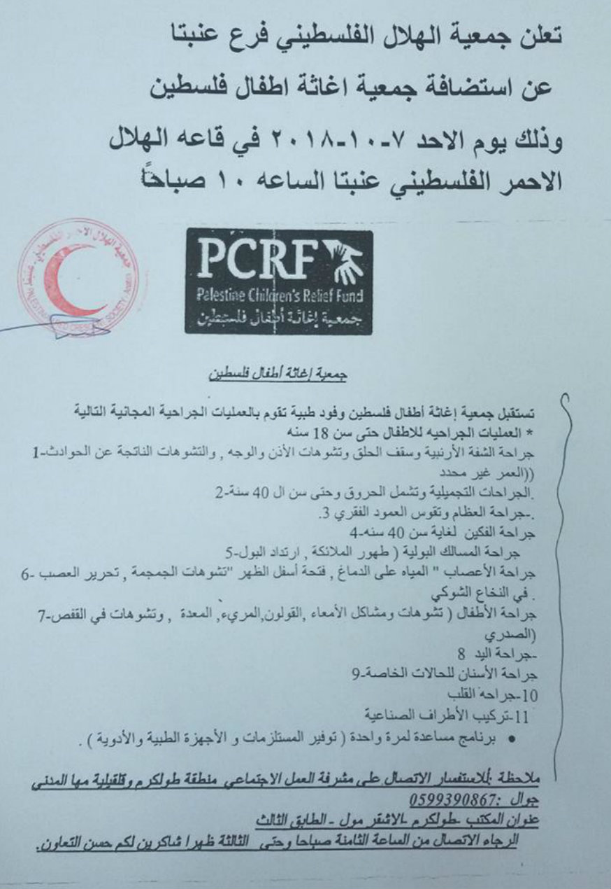 أعلنت جمعية الهلال الأحمر في عنبتا يوم الخميس 04.10.2018، عن استقبالها لجمعية إغاثة أطفال فلسطين يوم الأحد 07.10.2018، في تمام الساعة 10:00 صباحا.