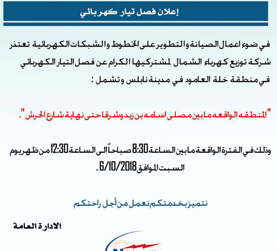 تعتذر شركة توزيع كهرباء الشمال لمشتركيها، عن اضطرارها لفصل التيار الكهربائي في نابلس يوم السبت 06.10.2018، وذلك لأربع ساعات.