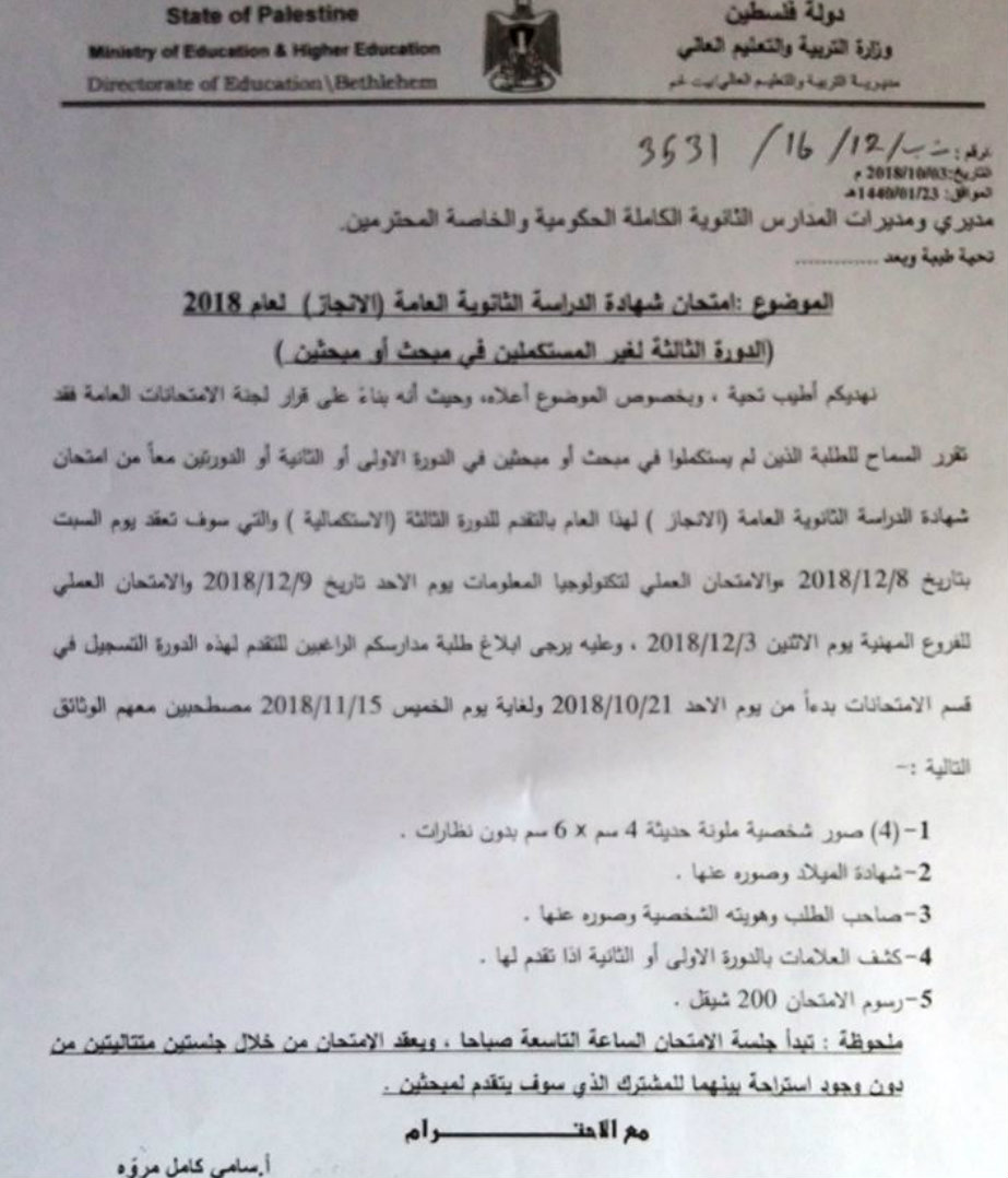 نشرت مدرسة ذكور زعترة الثانوية يوم السبت 06.10.2018، كتابا من وزارة التربية والتعليم العالي حددت الأخيرة فيه مواعيد الدورة الثالثة لغير المستكملين في امتحان الثانوية العامة "إنجاز"، وذلك ضمن الجدول أدناه: